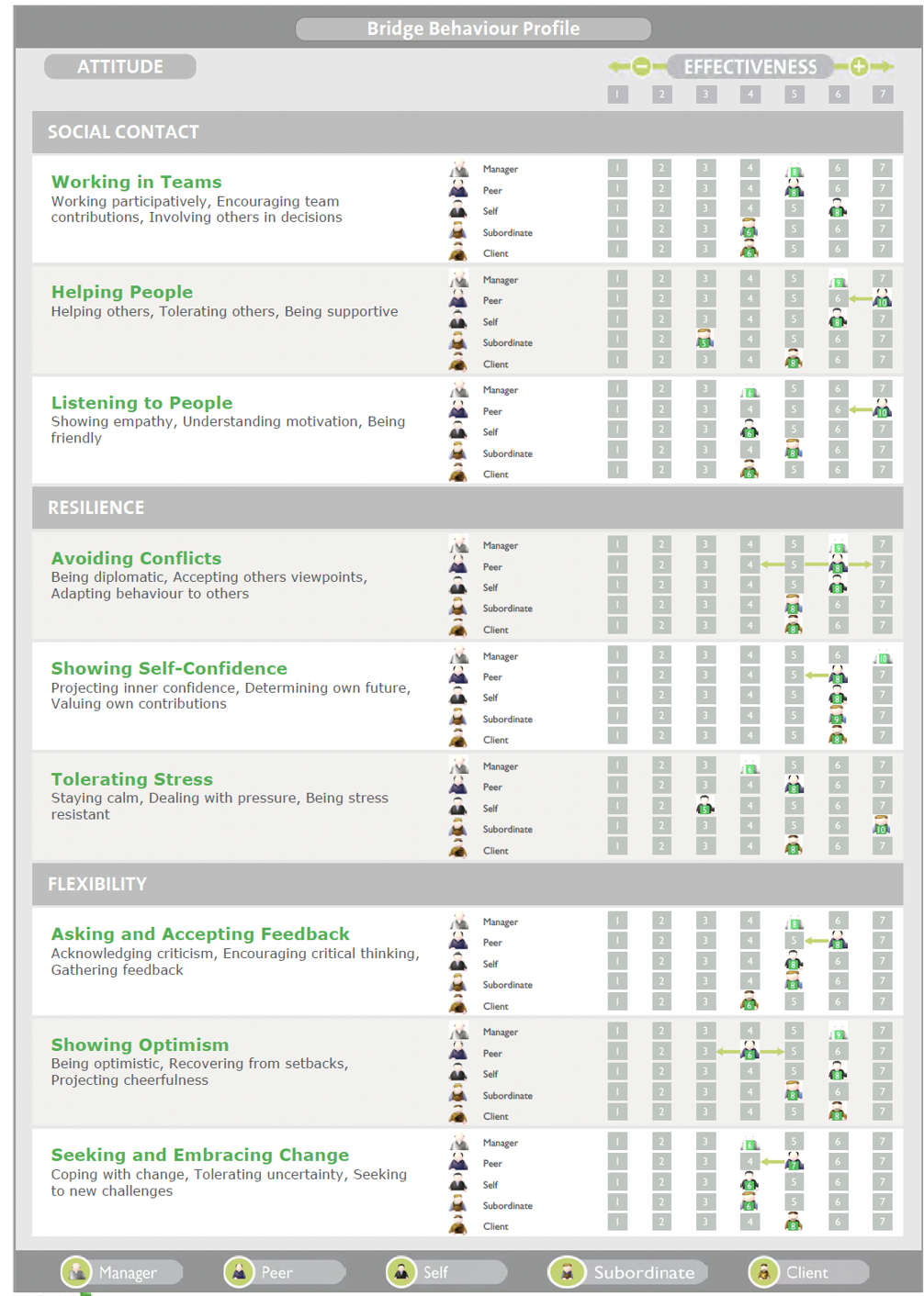 You can view a complete sample report of The Bridge 360 here. In this sample report, 360 degree feedback is shown from colleagues, managers, subordinates, clients, and the participant themselves. The report includes scores on the 34 Bridge competencies, a summary, and general feedback on the participant’s performance. Of course, it is possible to customize the report and add or remove competencies as desired.