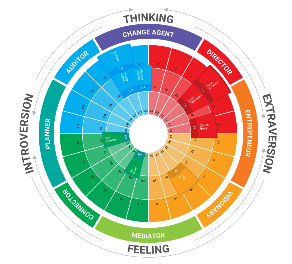 The 4-color personality wheel defines eight unique personality types by blending traits from neighboring colors on the personality wheel: