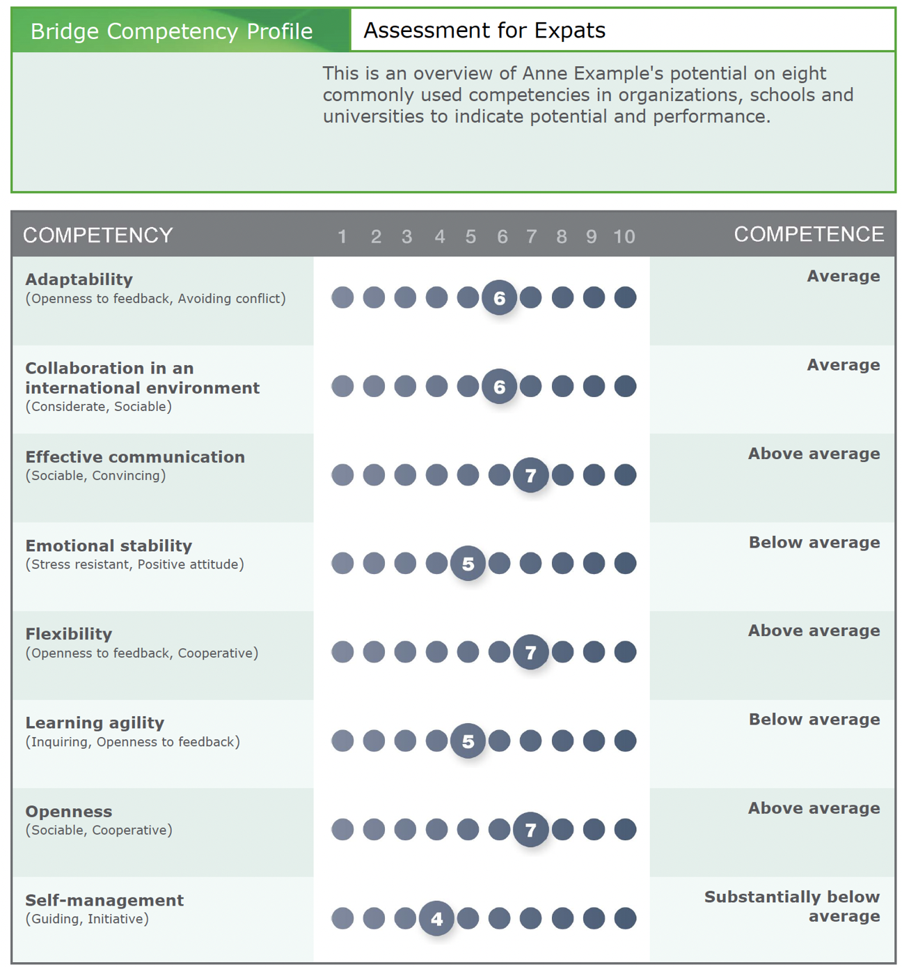 For expats, in addition to job-related competencies, adaptability and collaboration in an international environment are especially important. This assessment measures, among other things: