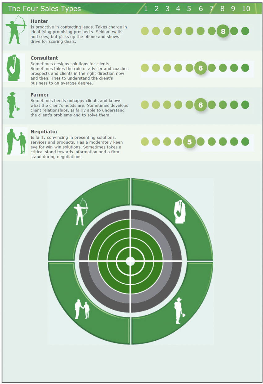 Identify your candidate's sales style. The sales report reveals how the candidate scores in the four distinct sales approaches: Hunter, Consultant, Farmer, and Negotiator. This insight helps in aligning their strengths with your sales strategy.
