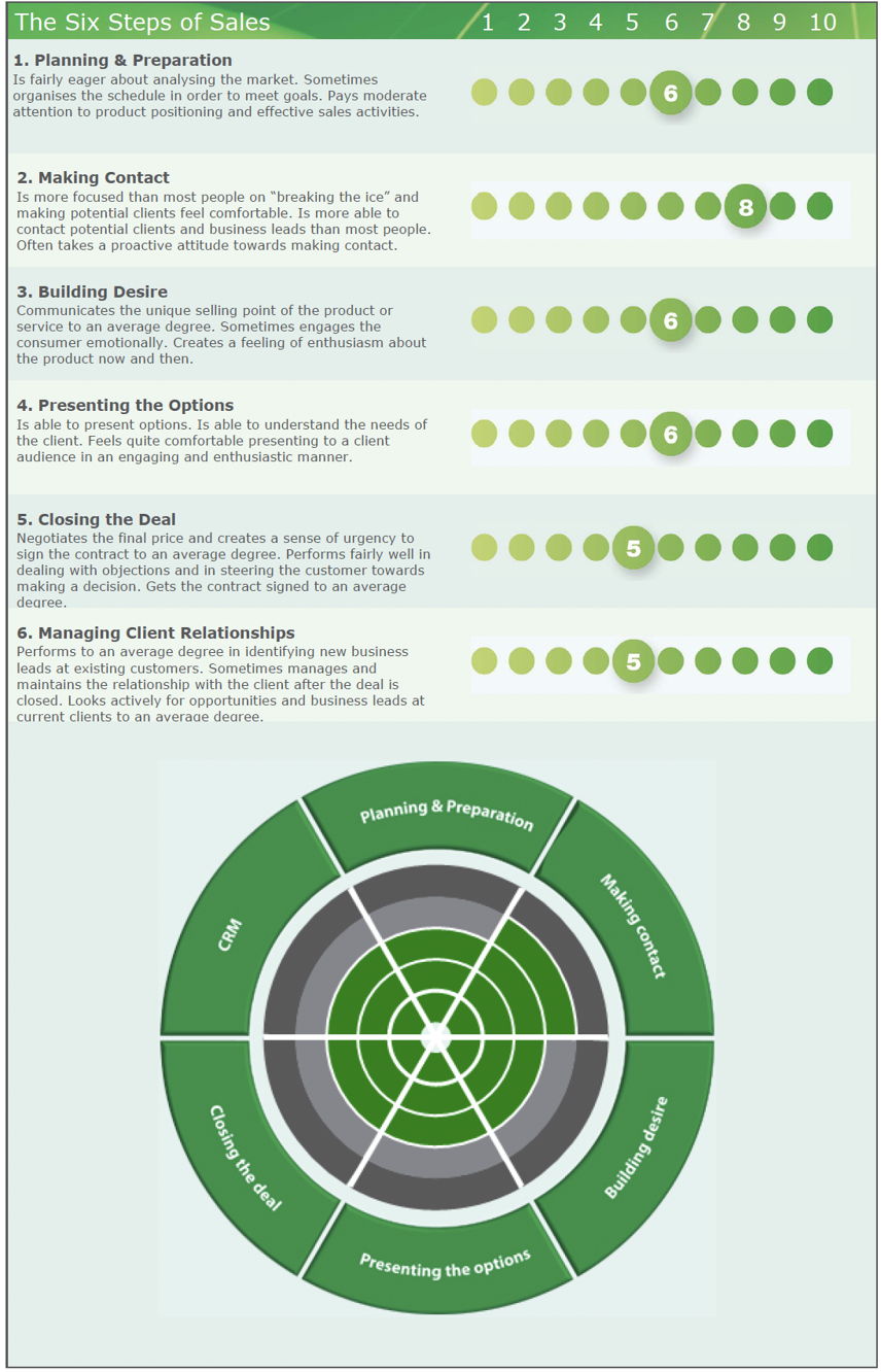Check out an example of the Bridge Personality sales report here. This report provides scores on the 6 steps of sales: 1) Planning & preparation, 2) Making contact, 3) Building desire, 4) Presenting the options, 5) Closing the deal, and 6) Managing client relationships. It also identifies whether the candidate is a Hunter, Farmer, Consultant, or Negotiator.