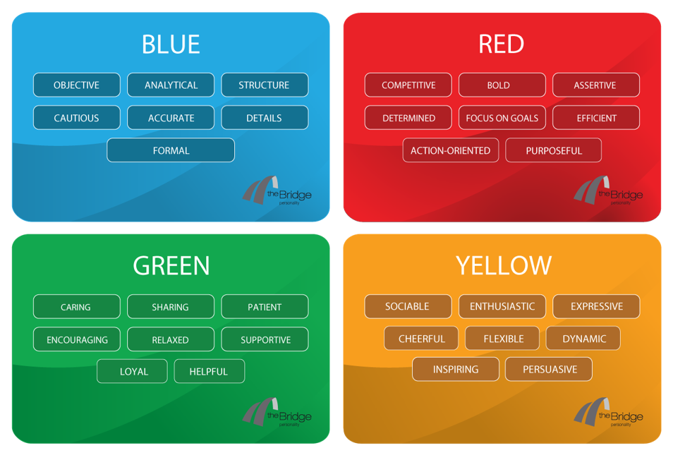 The four colors of The Bridge Personality Test represent specific sets of personality traits and behavioral preferences. These colors are: