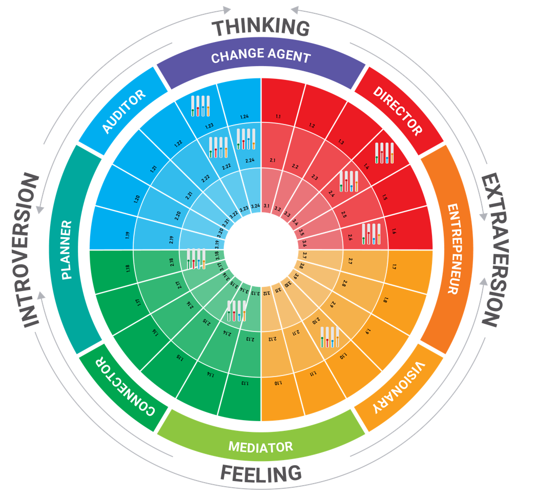 In addition to the four colours, The Bridge Personality also works with eight personality types. Each type is a blend of two adjacent colour energies and provides a more detailed picture of how people communicate, decide and collaborate. These types are displayed in the 4 color personality wheel. The types are: The Auditor (Blue), The Planner (Blue/Green), The Connector (Green), The Mediator (Green/Yellow), The Visionary (Yellow), The Entrepreneur (Yellow/Red), The Director (Red) and The Change Agent (Red/Blue). By using these eight types in a team session, organisations gain deeper insight into individual strengths and blind spots, making it easier to improve teamwork, assign roles effectively and guide personal development.